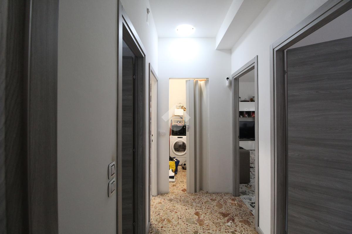 Il disimpegno presente in casa collega varie stanze come un ripostiglio attrezzato, la cucina abitabile, servita anch'essa da un balcone funzionale,il bagno, ristrutturato con doccia e le due camere matrimoniali, di cui una con balcone.
